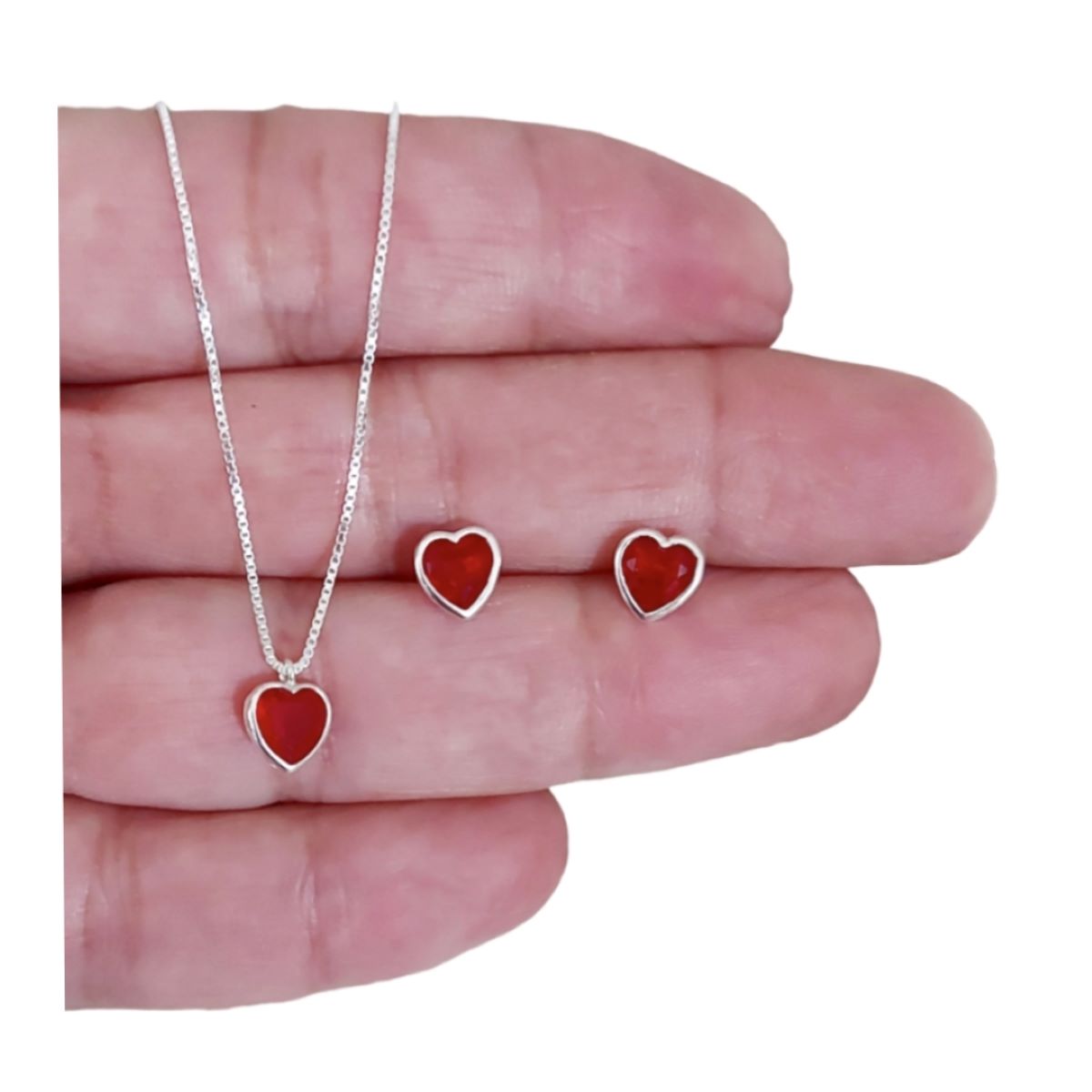 Lindo conjunto com Corrente Veneziana, brinco, colar e pingente de zirconia natural cor vermelho, Prata 925 Original.