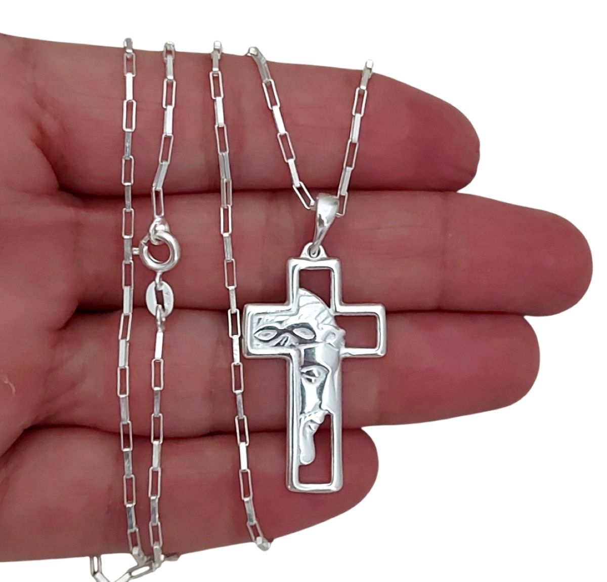 Conjunto de Corrente Cartie Tijolinho Italiana com Pingente Cruz Face de Cristo, Prata Original teor 925.