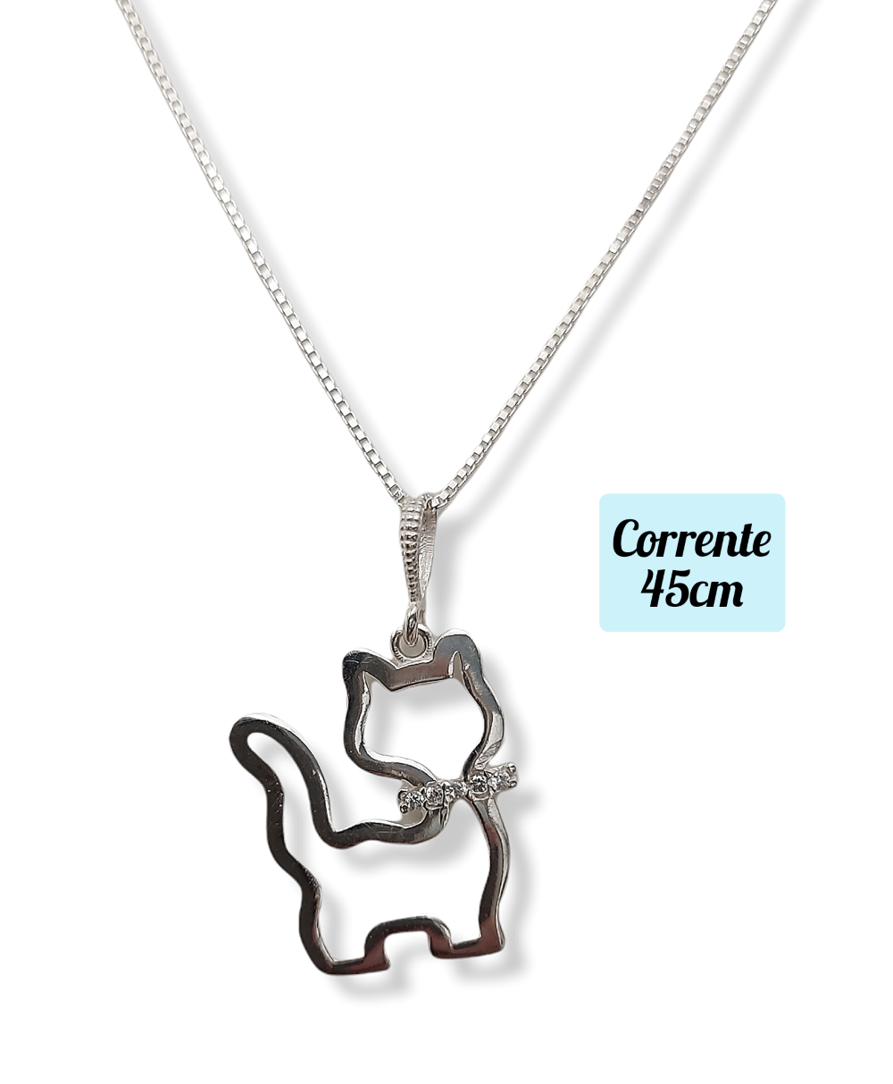 Linda Corrente Veneziana com Pingente Gatinho, com colerinha cravejado de Zirconias, Prata de Lei 925.